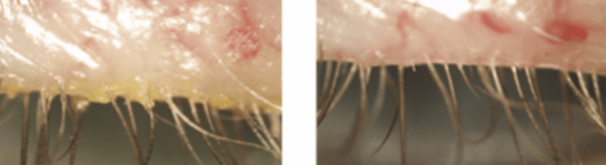 En la siguiente imagen podemos observar un párpado con las glándulas de Meibomio obstruidas y el mismo párpado tras el tratamiento ya realizado.